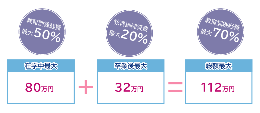 | 給付金支給 | ①受講中 学費の50%(上限2年制:80万円)を支給 ②修了後 上乗せ20%(上限2年制:32万円)を追加支給 ※最大112万円の支給を受けるには、受講修了日の翌日から1年以内に「就職決定(一般雇用保険の被保険者)」が条件となります。 |