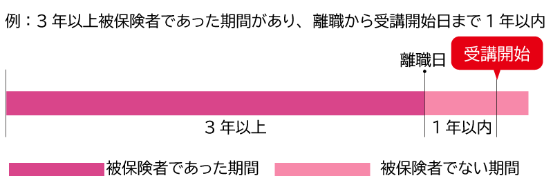 受講開始日に被保険者でない方のうち、離職日の翌日以降、受講開始日までが1年以内(適用期間の延長が行われた場合には最大20年以内)であり、かつ支給要件期間が3年以上ある方